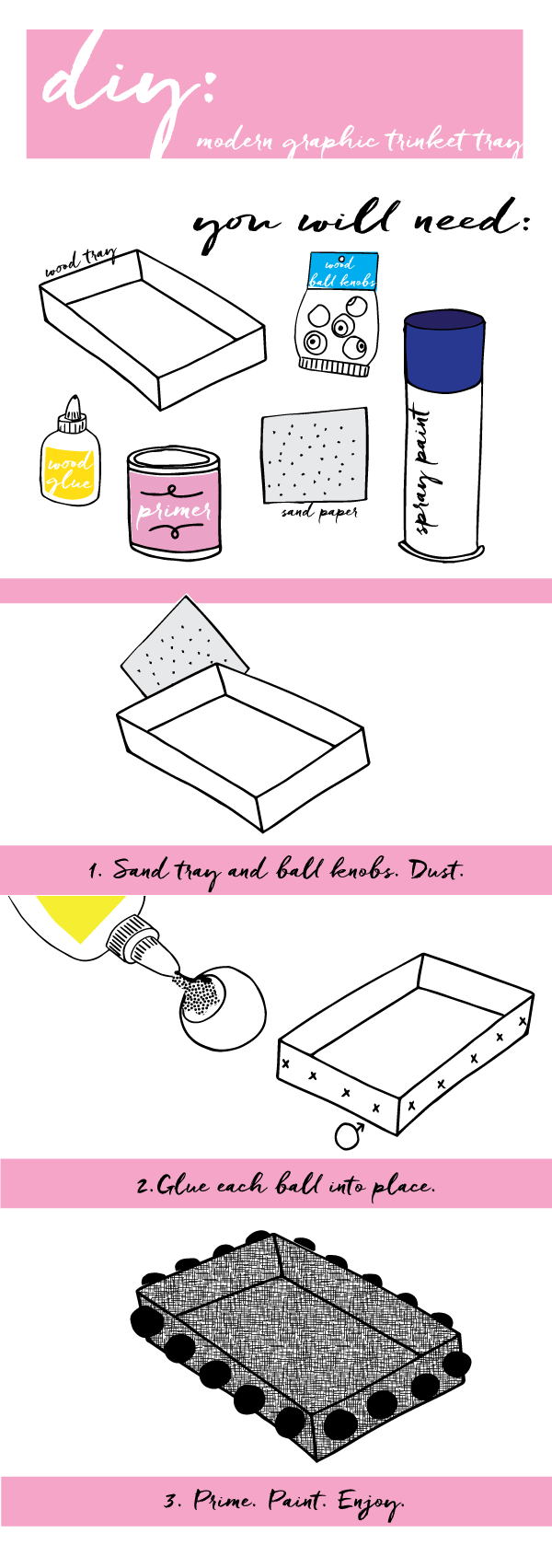 unfinished wood tray (8"x12"), 18- 1.25" wood ball knobs, sand paper fine grit, wood glue, primer (canned or spray is fine, this is the secret sauce to getting a nice finish on the final coat), and a can of spray paint (in high gloss)