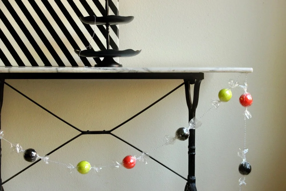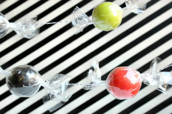 I used some styrofoam balls and clear mylar wrap to make the perfect non-melting candy. I painted these for the upcoming Halloween in orange, green and black. You could paint them any color you like for a birthday party garland or even, in just a few short months, make them for your tree.