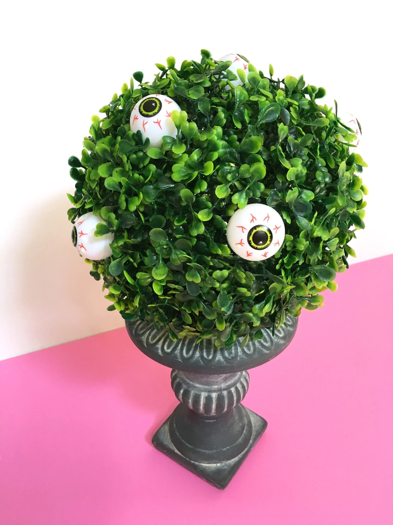 I always feel like, somebody’s watching meeeeeeeee. It’s that time of year when I try to creep out my kids and give them a little spook. Unfortunately, I haven’t been able to watch super scary movies since I was in college and I just can’t be too gory, cause ew, right? I might be a sugar puff when it comes to Halloween, but I love to add a fun dose of spooky with hilariousness. I am always on the lookout for cute little details to DIY or add to really amp up my Halloween décor. This year I finally feel like we have a good collection of decorations, it has taken a few years to get here. The best holiday décor is collected over many years. Last year, I found a cute bag of eyeballs at the dollar store and I used them in bowls and a tall vase. I also took a picture with the eyeballs in a faux hedge and had this DIY idea. A DIY eyeball topiary.
